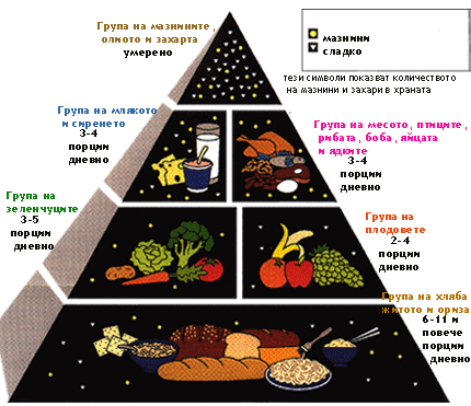 Това е илюстрирано с така наречената "пирамида на храненето" . Тя представлява нагледна диаграма, разработена през 1992 година от експертни подразделения на USDA (американски аналог на нашето Министерство на Селското стопанство и горите). В диаграмата можете да видите тези групи продукти, които току що обсъдихме. Те са разположени на различни нива на символичната пирамида (мляко и месо, т.е. групи №4 и №5 са обединени не случайно) . Колкото по-близо се намира даден продукт до върха – толкова по-малка е неговата пропорционална част от количеството на продуктите в менюто на бременната жена.